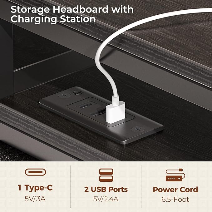 - Convenient Charging Station Bed: The headboard includes a built-in power panel with 2 USB ports and 1 Type-C port, allowing you to conveniently charge your tablet, phone, or other mobile devices