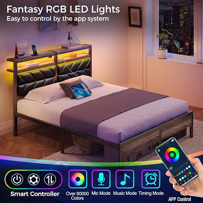- Multi-function LED Light: Experience the sophistication of this metal bed frame, enhanced by vibrant multi-colored RGB LED light strips. Use the mobile app to explore a spectrum of over 60,000 colors, allowing you to customize brightness, colors, patterns, and timer settings according to your preferences, creating a romantic atmosphere