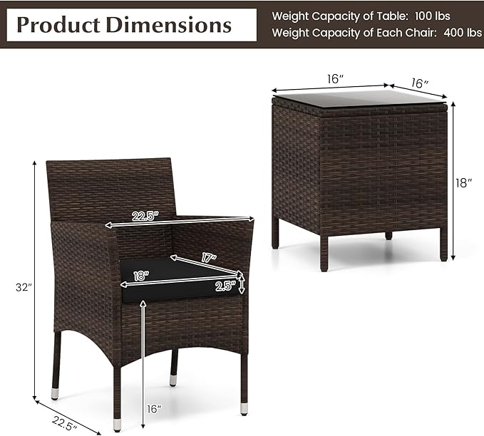 - Multi-scene Application: This 3-piece outdoor bistro set includes 2 armchairs and 1 coffee table. Modern style makes this set match perfectly with your outdoor space like porch, backyard, poolside. Dimension of Chair: 22.5" x 22.5" x 32" (L x W x H). Dimension of Coffee Table: 16" x 16" x 18" (L x W x H). Dimension of Seat Cushion: 18" x 17" x 2.5"(L x W x H).