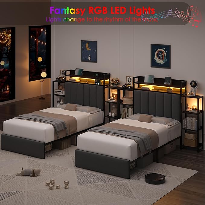 Keyluv Twin Bed Frame with Storage Headboard & Charging Station, Upholstered LED Platform Bed with Bedside Storage Rack & Drawer, Metal Slat Support, No Box Spring Needed, Linen Fabric, Black