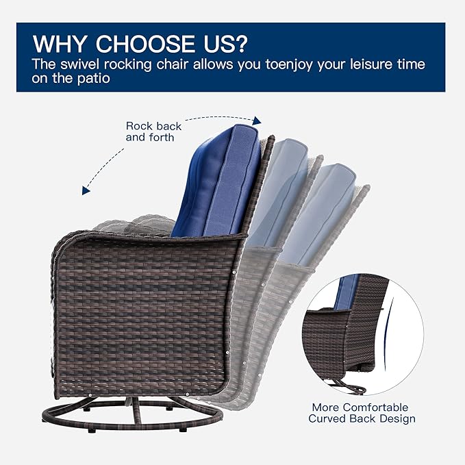 - Swivel & Rocking Chairs: Two of the chairs have a dual-function base that swivels 360 degrees and also glides smoothly back and forth. Allowing you to swivel in any direction as needed to relax in ultimate comfort while sitting on your front porch or backyard. The base is equipped with multiple non-slip pads that allow the outdoor glider patio chairs to stand steadily without wobbling