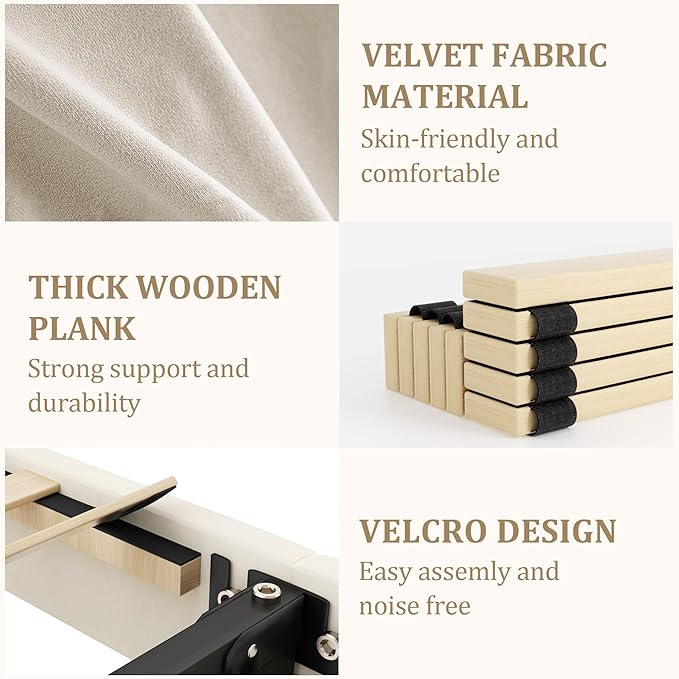 - BED FRAME WITH HEADBOARD: The full bed frame with 47-inch tall headboard and wing panels, wrapped in velvet with a tufted texture. It incorporates high-resilience memory foam, not only provides optimal comfort and support, but also adds a cozy and artistic ambiance to the bedroom.