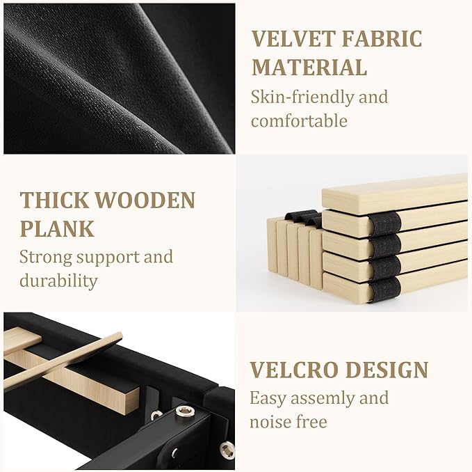 - BED FRAME WITH HEADBOARD: The full bed frame with 47-inch tall headboard and wing panels, wrapped in velvet with a tufted texture. It incorporates high-resilience memory foam, not only makes the bed frame more comfortable to the touch, but also adds a cozy and artistic atmosphere to the bedroom.