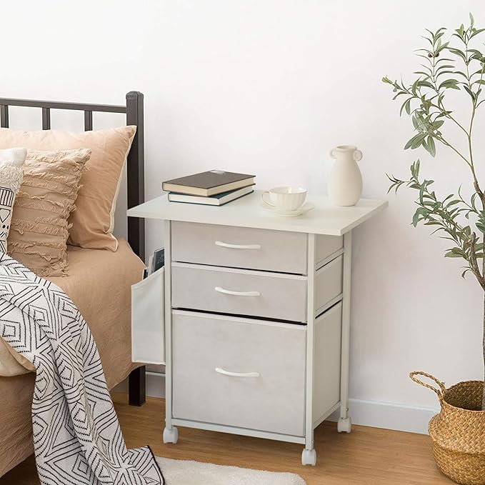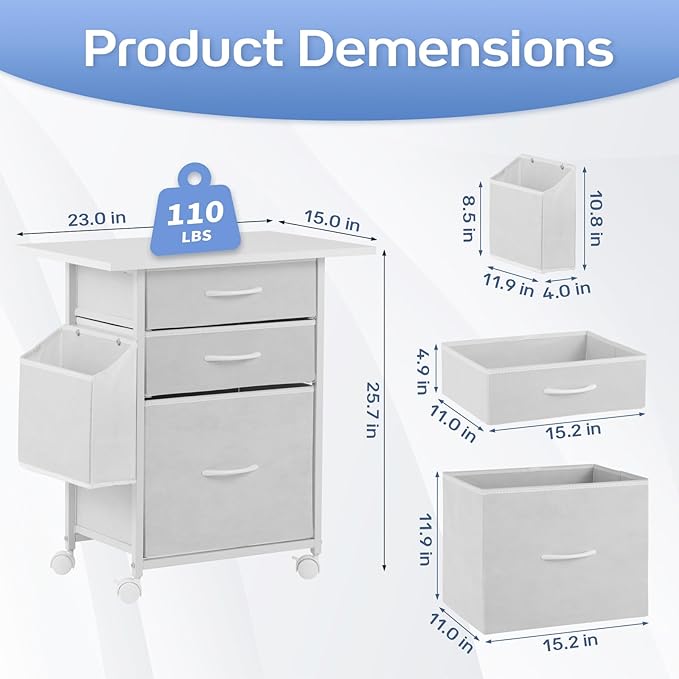 - 【Maximizes Storage Space】This filing cabinet with 3 fabric storage drawers is designed to keep the office machines, paper, and files organized. The side bag holds A4 paper and stationery for quick access. Perfect for your office or home workspace.