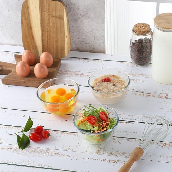 - Versatile uses glass mixing bowls - This glass mixing bowl is ideal for a variety of uses with meal prep, including beating eggs, making salad dressings, mixing small amounts of things, etc., and also great for serving soup, salad, ice cream, hot cereal, etc. The solid glass material also enables this clear bowl to be a water dish or food dish for an animal that is easy to keep clean. This multi functional glass serving bowl will perfectly meet all your daily needs.