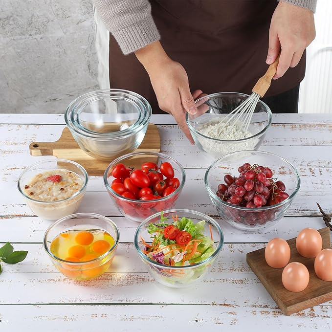 - Premium glass mixing bowls - This glass bowl is made from food-grade borosilicate glass, which is crystal clear, allowing you to see the color of the contents clearly. And the thick borosilicate glass can perfectly withstand high temperatures or rapid changes in temperatures that is convenient for you to heat or bake without having to worry about transferring to another dish. This glass mixing bowl is dishwasher, oven, microwave, disinfection cabinet and refrigerator safe.