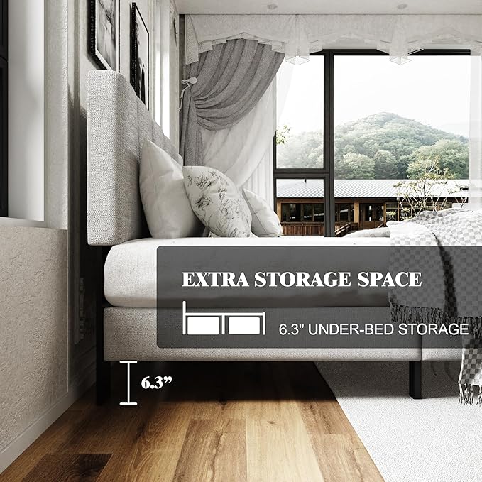 King Size Platform Bed Frame with Upholstered Headboard, Wooden Slats Support, Noise Free, No Box Spring Needed, Easy Assembly, Light Grey, Linen