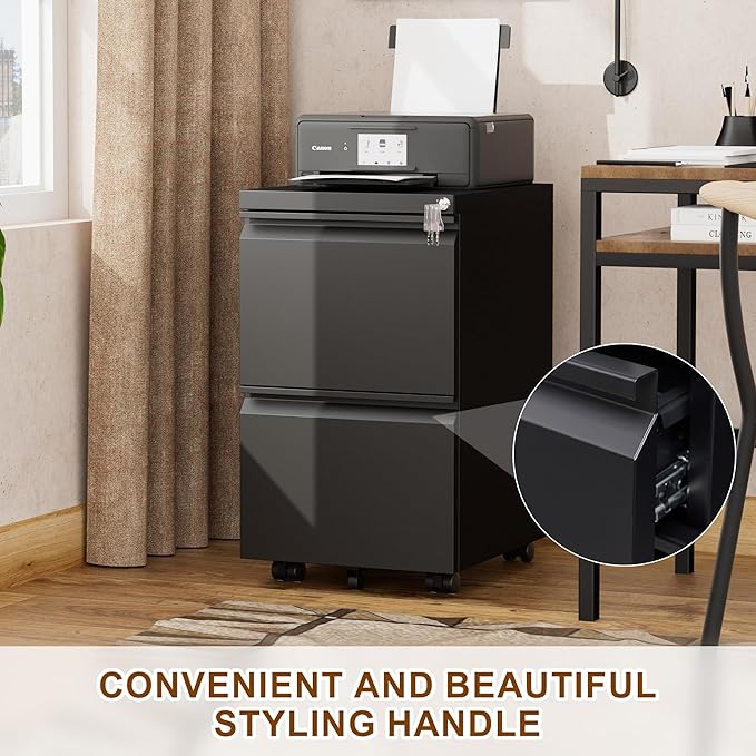 Metal Mobile File Cabinet with Lock and 4 Keys - Fully Assembled, Under Office Desk 2 Drawers Filing Cabinet for Home Office with Anti-tilt Wheels, A4/Legal/Letter Hanging File Drawers
