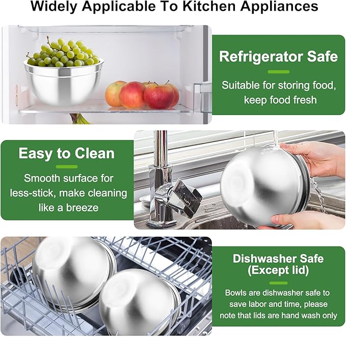 - Easy Clean & Dishwasher Safe - Bright mirror interior surface for easy food release and anti-fingerprint matte exterior for good stain protection, Easy to clean and looks like getting a new one after washing, The metal bowls are dishwasher safe to save labor, The plastic lids can only be washed by hand to avoid deforming