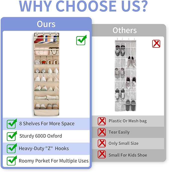 - 8 Shelves Large Capacity: Over the door shoe rack measures 68"H*16.5"L*6"W. Please measure the height of the door is greater than 71 inches before buying. Hanging shoe storage with 13 pockets in different sizes can hold more than 22 pairs of shoes.Shoe closet organizer is large and deep enough to store high heels and boots.And back of door shoe organizer is a great home storage organizer and helps to increase more space for over door, closet, wall, dorm, and RV, making your room more tidy and clean.