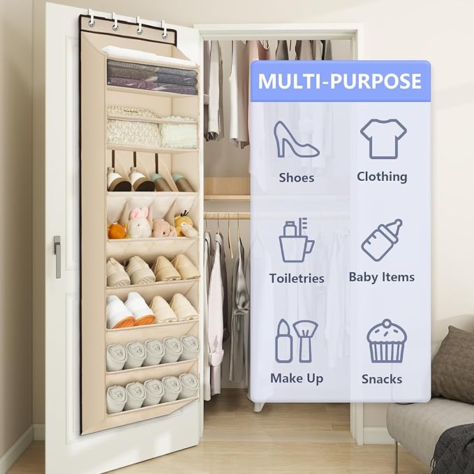 - Space Saving: The shoe rack for door will make the best possible use of the storage space. Hanging shoe storage is a perfect choice for small spaces like closet,pantry room,laundry room, bath room,RV, and dorm. It keeps all kinds of items tidy, maximizes the use of small spaces.