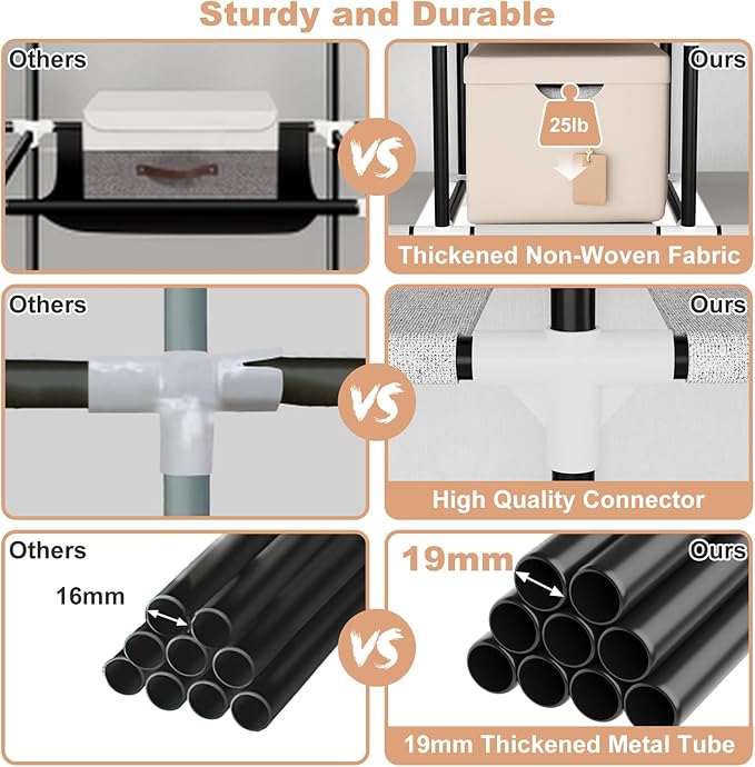 - Sturdy Portable Wardrobe: This portable closet wardrobe is made of 19mm diameter metal tubes, reinforced plastic connectors, and premium non-woven fabrics. The hanging rail holds up to 44 lb, and each shelf is 22 lb, provides super load capability