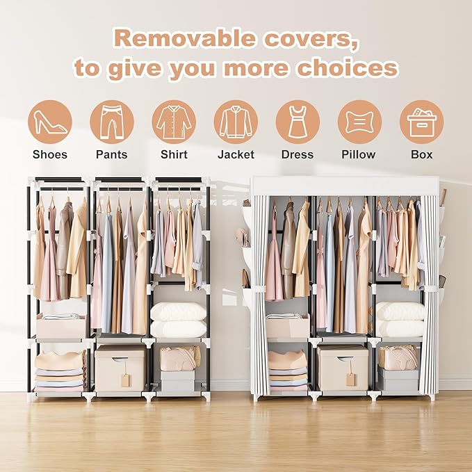 - Portable Wardrobe with Dust-proof Covers: This portable closet with cover provides good protection for your clothes. The wardrobe covers is made of premium non-woven fabric, which is durable and breathable. Zipper closure, easy to open and close