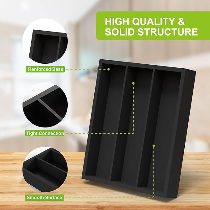 - EFFECTIVE USE OF SPACE - The bamboo cutlery tray is suitable for home and workplace. The tray features an ingenious design to help you organize your flatware, cutlery and kitchen gadgets without creating a mess in the drawer Moreover, our bamboo utensil holder organizer looks orderly, with clear levels, allowing the space to be used rationally. this cutlery tray with black luxury can help you save storage space and improve the aesthetics.