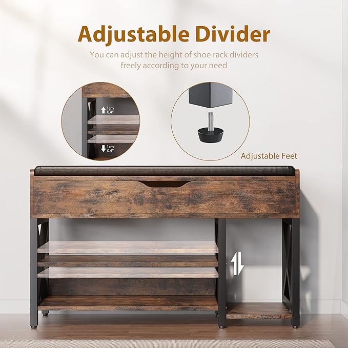 - 【Stable & Durable Material】Shoe rack for entryway features durable particleboard and sturdy steel, they provide excellent texture and stability for the shoe rack. This storage bench with seating is made of soft leather, changing shoes is conviniently more comfortable. Full weight bearing of this shoe bench as tolerated (FWBAT) is 220 pounds (about 99.8 kg) .