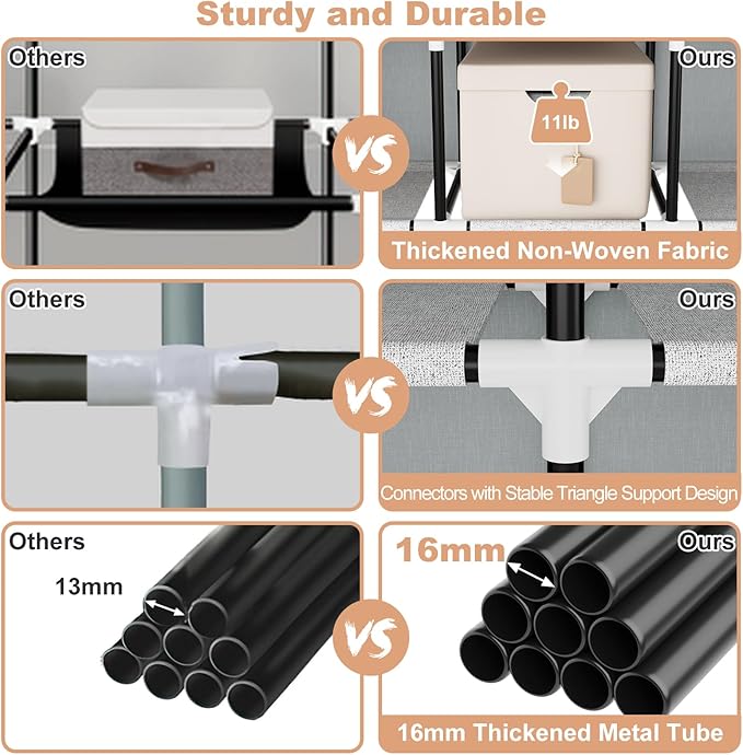 - [Sturdy and Durable Structure] Clothes storage organizer is made of 16MM thick metal tubes, high quality non-woven fabric and reinforced PP plastic connectors, which always provide strong support for your clothes and durable to meet your long-term storage needs.