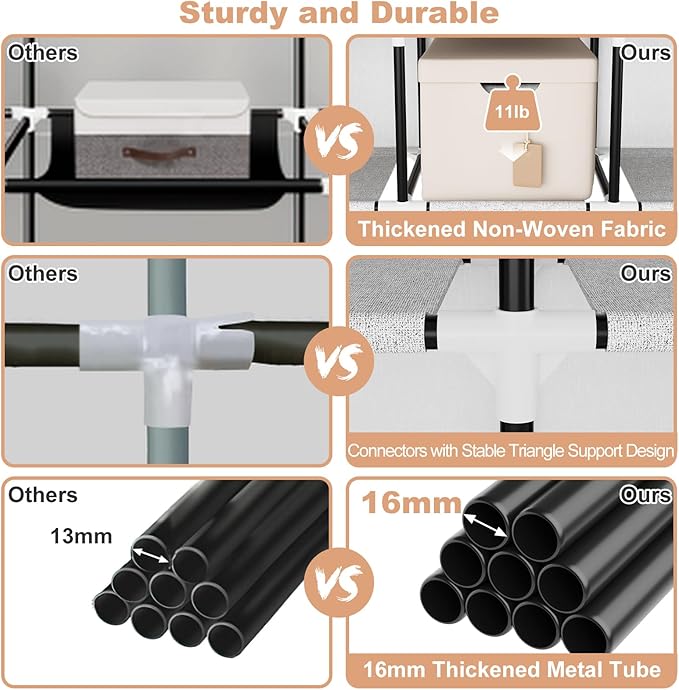 - [Sturdy and Durable Structure] Clothes storage organizer is made of 16MM thick metal tubes, high quality non-woven fabric and reinforced PP plastic connectors, which always provide strong support for your clothes and durable to meet your long-term storage needs.