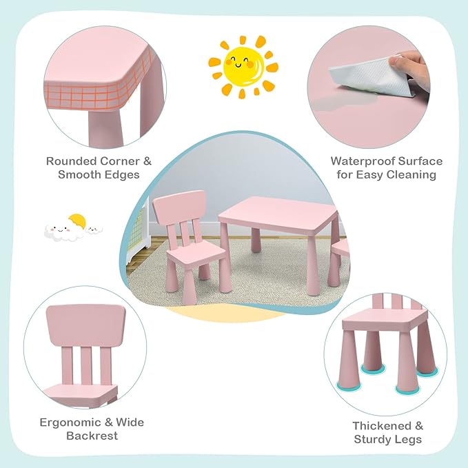 - Safe and Stylish Design: The toddler table and chairs is designed with rounded edges and smooth lines to protect your child's delicate skin from scratches. Additionally, the bright and delightful color design complements any child's space, making it not only a safe choice but also a stylish one.