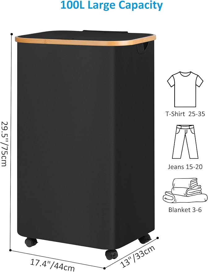 efluky Laundry Basket with Wheels, Tall Rolling Laundry Hamper with Lid and Removable Bag, Aesthetic Dirty Clothes Hamper on Wheels for Laundry Room, Bedroom, Dorm and Bathroom, 100L Black