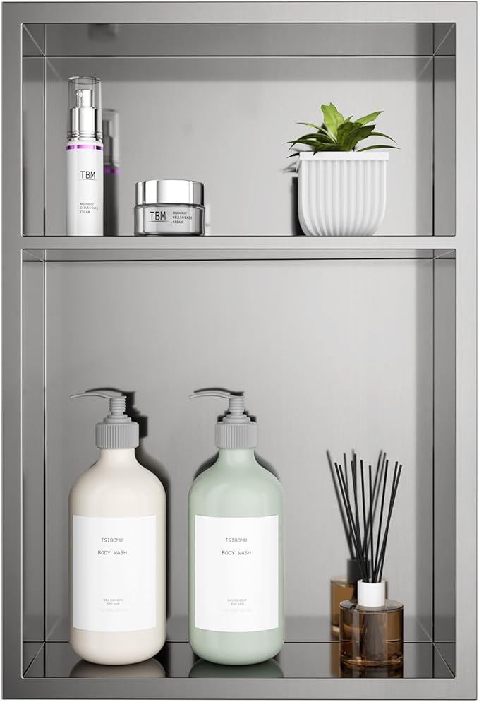 - 【Brushed Nickel Stainless Steel – Rustproof & Waterproof】Crafted from premium stainless steel with a brushed nickel finish, this shower niche is waterproof, corrosion-resistant, and rustproof, ensuring long-lasting durability in humid bathroom environments