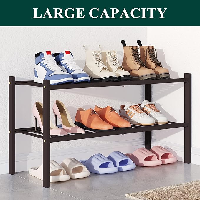Smiry Bamboo Shoe Rack for Closet, 2 Tier Wooden Stackable Shoe Organizer, Free Standing Shoes Storage Shelf for Entryway, Front Door Entrance, Brown