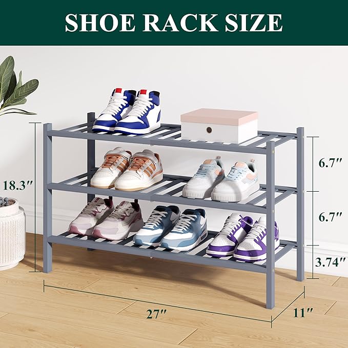Smiry Bamboo Shoe Rack for Closet, 3 Tier Wooden Stackable Shoe Organizer, Free Standing Shoes Storage Shelf for Entryway, Front Door Entrance, Grey