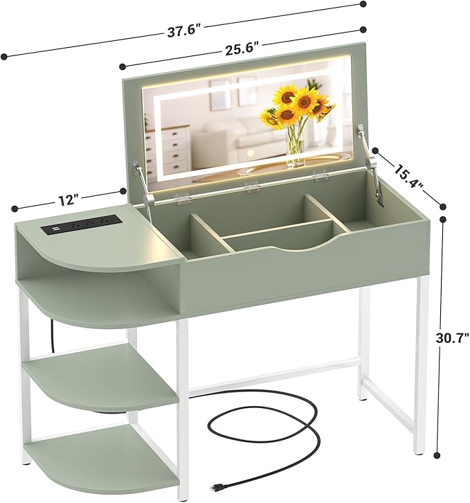 Cyclysio Vanity Desk with Flip Top Mirror and Lights, Makeup Vanity Desk with Drawers, Dressing Table with Storage Shelves & Charging Station, Small Vanity for Small Spaces, Green