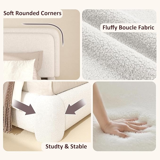 King Boucle Platform Bed Frame with Height Adjustable Headboard, Modern Upholstered Cloud Bed, Sleek Curved Design, No Box Spring Needed, Easy Assembly, Noise Free, White