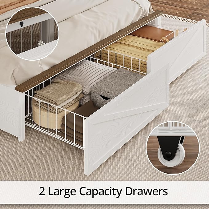 IRONCK Farmhouse Queen Size Bed Frame with LED Light and Charging Station, Wood Bed Frame with Storage Headboard and 2 Drawers, Barn Door Design, Sturdy and Noiseless, White