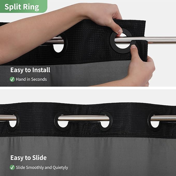 - 【Ringless Shower Curtain】:This shower curtain with no hooks features an innovative "open ring" that allows for easy hanging and hassle-free installation.No need to remove the shower rod or purchase additional hooks
