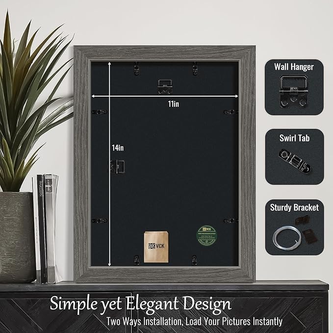 - Effortless Installation: Our grey picture frame not only comes with hanging hardware for both horizontal and vertical display, but also features a unique spin-lock design. Perfect for wedding photos, graduation diplomas, or festive wall art, it allows easy loading of 11x14 or 14x11 content