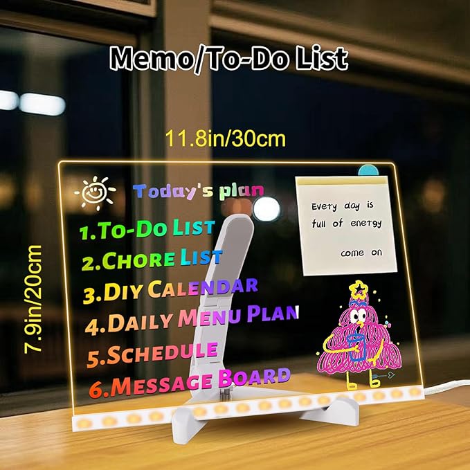 - Colorful Note Board: Acrylic Dry Erase Board with light 11.8 X 7.9” can be used as a drawing board, writing, or a night light, A beautiful reminder board in the dark.and can be used for to-do lists, message boards, calendars, shopping lists,daily plans, and memos. Suitable for offices, homes, hotels, coffee shops, restaurants,etc