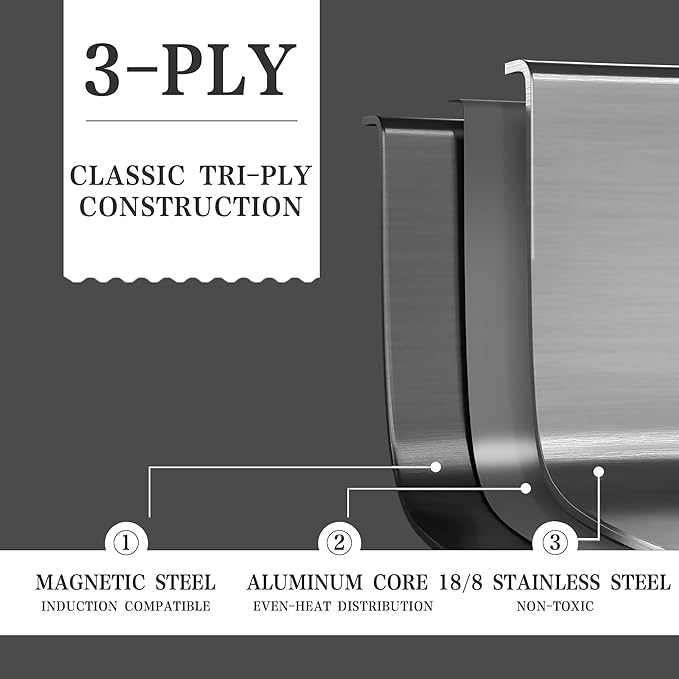 - Tri-ply Construction: The stainless steel pot and pan body are all tri-ply bonded construction ensuring optimal heat distribution for fast even heating and energy saving, will spend 20% of Gas or electricity that you have spent in cooking before