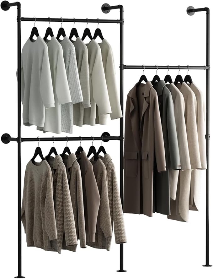 - Space-Saving Design: Featuring a wall-mounted design with 3 sturdy hanging rods, this black clothing rack for hanging clothes effectively frees up valuable floor space while maximizing your storage capacity. Now you can stylishly organize your clothes with ease!