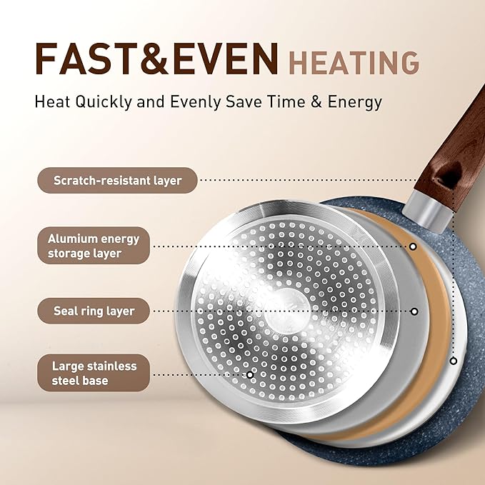 - 𝐄𝐚𝐬𝐲 𝐭𝐨 𝐂𝐥𝐞𝐚𝐧: Say goodbye to scrubbing and soaking. Our cookware features a smooth, easy-to-clean surface, ensuring that tidying up is as simple as enjoying your delicious creations. Easy to clean granite pots and pans