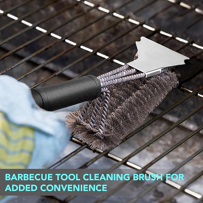 - [Complete BBQ & Grill Tool Set] The XSSIVE 5-Piece BBQ Grill Tool Set includes everything you need for outdoor grilling and cooking: a fork, spatula/turner, tongs, basting brush, and grill brush and scraper with extra strong, safe wire bristles and triple scrubbers. This barbecue cleaning brush is perfect for gas and charcoal grilling grates and ensures tough grill cleaning. Ideal for backyard BBQ, camping utensil set, and outdoor grill accessories.