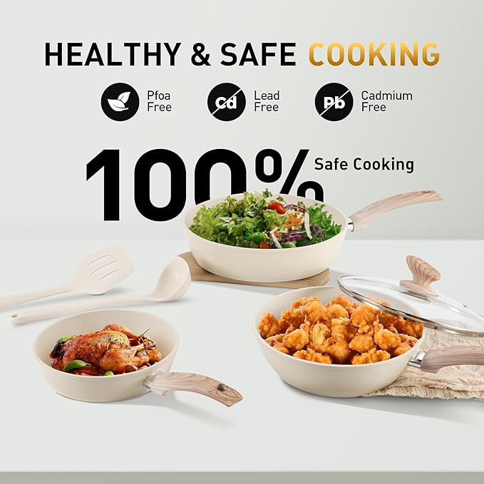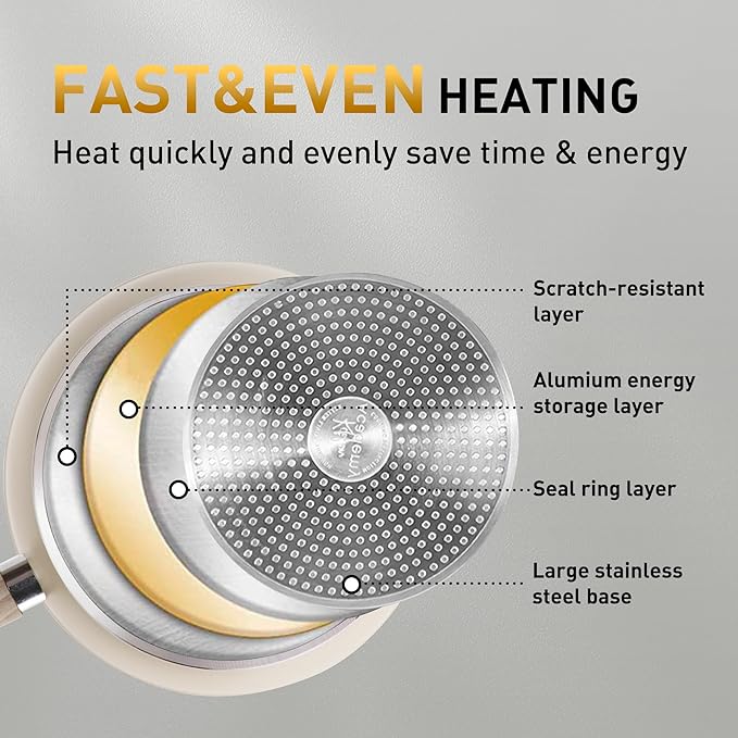 - 𝐄𝐯𝐞𝐧 𝐇𝐞𝐚𝐭𝐢𝐧𝐠 𝐓𝐞𝐜𝐡𝐧𝐨𝐥𝐨𝐠𝐲: Our pots and pans set is excluding of PFOS,PFOA, The set's even heating technology guarantees uniformly cooked meals. No more hot spots or unevenly cooked food – every dish is a masterpiece. Nonstick pot set for precise cooking