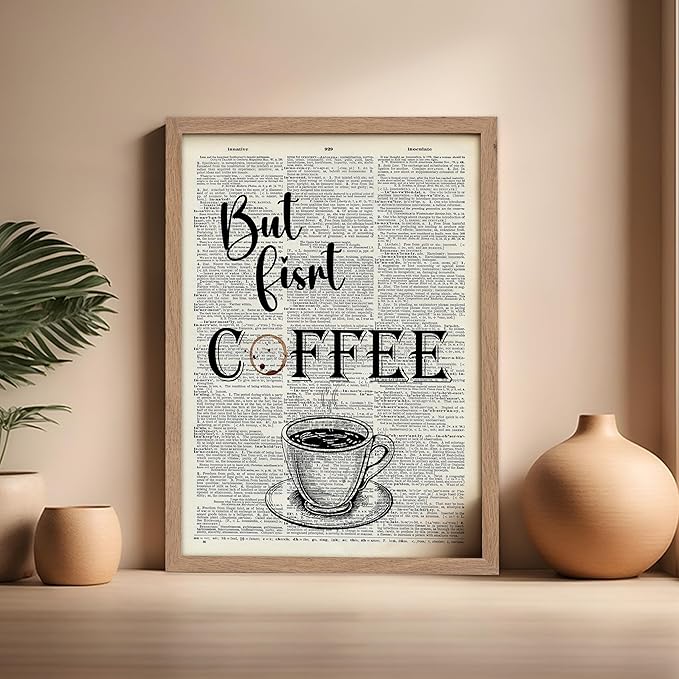Poster Master Dictionary Art Poster - But First Coffee Print - Cafe Art - Gift for Men, Women, Coffee Lovers & Barista - Funny Decor for Kitchen, Restaurant or Dining Room, 16x20 Beige Framed
