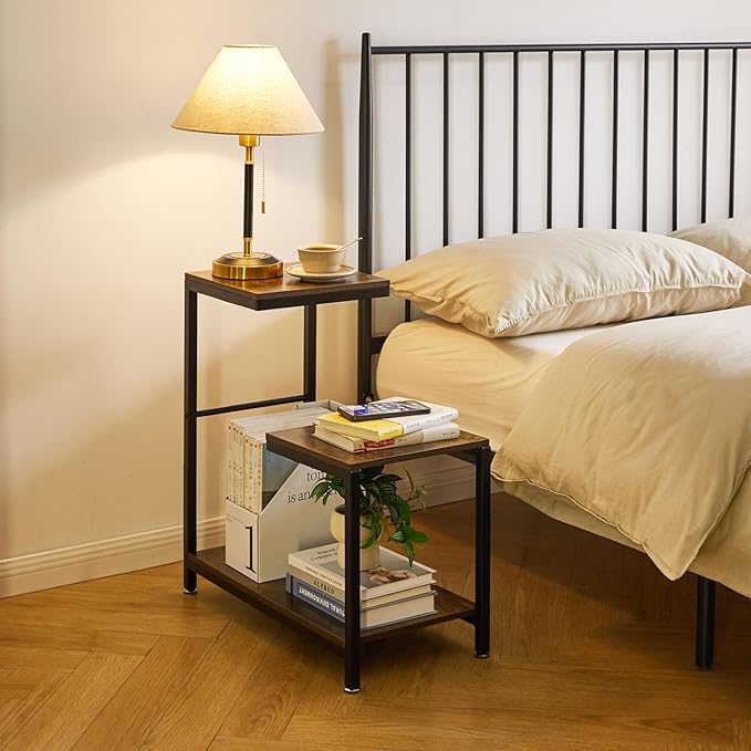 G-Shaped End Table, 3 Tier Side Table with Metal Frame for Living Room Corner Tables, Balcony, Couch, Bedroom Rustic Brown YD-TM053H