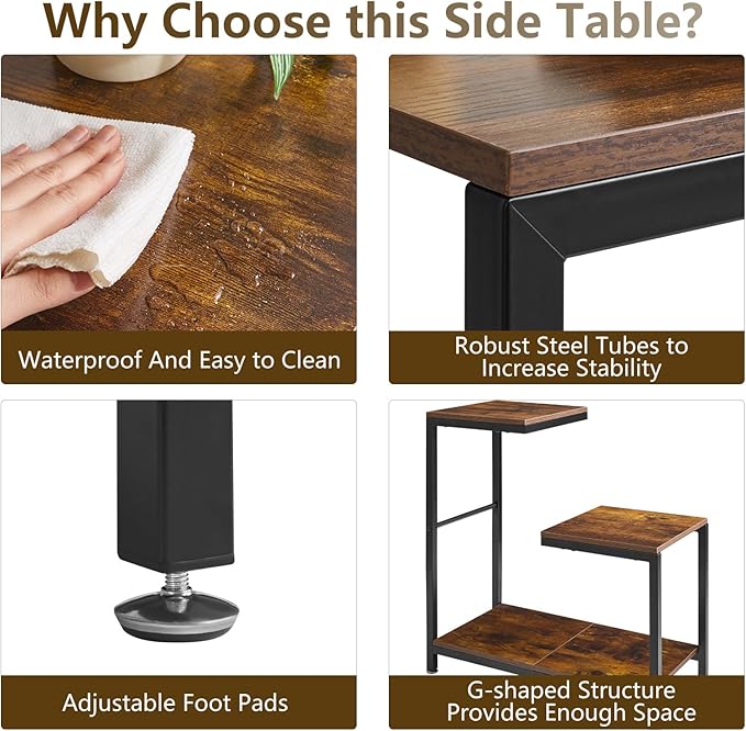 - Sturdy and Stable: The Aibiju side table is made of sturdy steel pipe and high-quality artificial wood, with a load-bearing capacity of up to 50 pounds. The sturdy square frame ensures the stability of this sofa side table, preventing it from wobbling. The wood grain tabletop is waterproof and very easy to clean. With its clean lines and neutral tones, this G-shaped side table can easily complement your existing decor