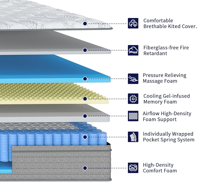 - 🛏️Pressure relief & edge support: King memory foam hybrid mattress offers a medium firmness sleep experience. Underneath the mattress cover lies a layer of comfort foam that conforms closely to the body's shape and relieves pain at pressure points. We have enhanced the hybrid mattress with individual pocketed springs, and the inner springs have two sizes of wire diameters: 2.0 mm (for mattress body support) and 2.2 mm (for edge support). This gives it better support and firmness without collapsing at the edges.
