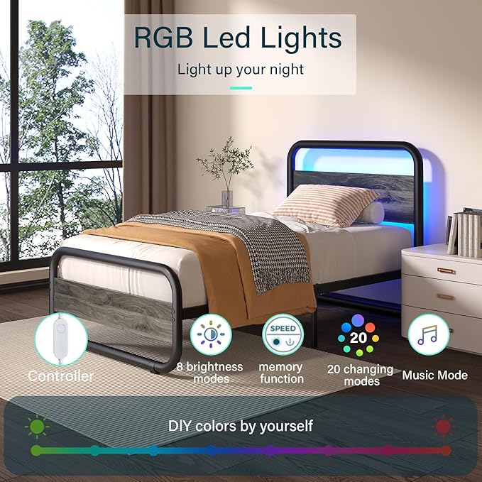 - RGB LED for Leisure Night: The RGB LED of the rustic twin bed could adjust 20 modes will provide a leisure atmosphere for your night. Twin size bed frame combines industrial with LED add more different style
