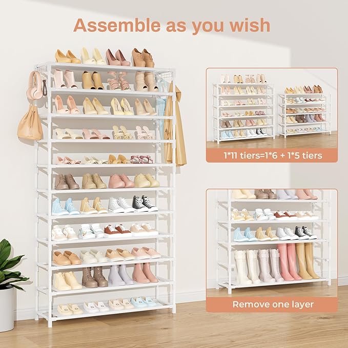 - 【Large Capacity 11 Tier Shoe Rack】The 11 tier shoe organizer can store up to 55 pairs of adult shoes, and you can remove one layer to fit long boots. This shoe rack organizer is not only suitable for shoes, but also for bags, toys, towels, sundries, books, plants and small accessories. Shoe storage with 10 hooks, you can hang keys, umbrellas, bags, etc., very practical design.