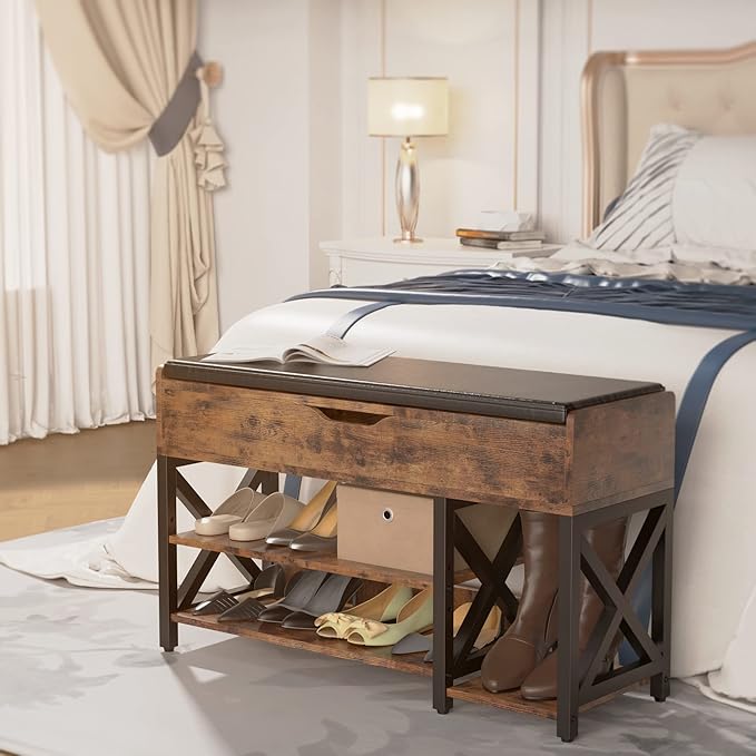 - 【Unique Vintage Shoe Bench Design】Shoe Bench combines the comfortable faux leather, vintage wood elements, and a black metal frame in a plain and noble style; Subtle stitching of quilted leather is chic and modern. Not only it could be used as a shoe bench or storage bench, but also as a shoes-changing bench, adding particular charm to your home.