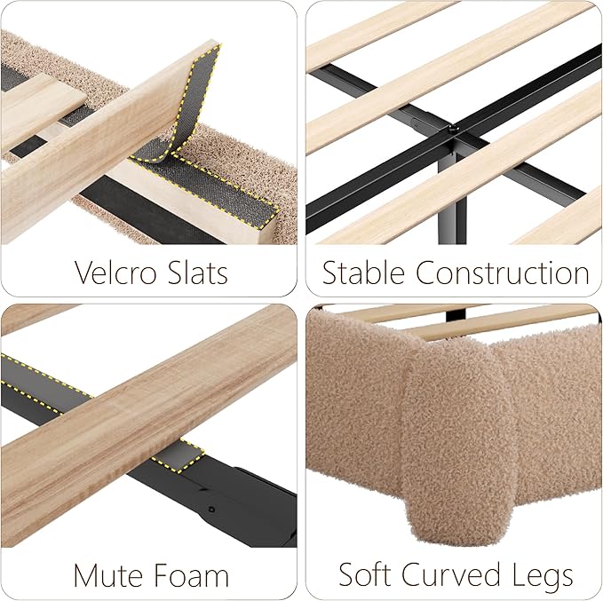 - Stylish Comfort: Elevate your space with this upholstered queen bed, wrapped in soft boucle fabric for a cloud-like touch. The plush headboard adds both style and comfort, turning your bedroom into a warm, modern retreat