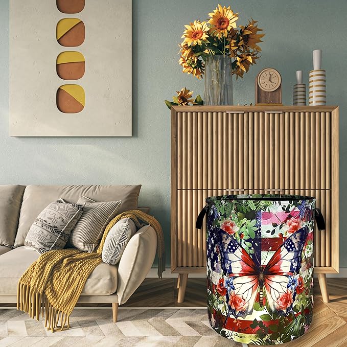 Beautiful Butterfly American Flag Laundry Basket Foldable Oxford Cloth Laundry Hamper With Handle Portable Clothes Storage Basket 18.9 X 16.5 Inch Storage Bag For Laundry Room/Bathroom/Bedroom