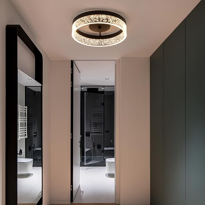 Jaycomey Modern LED Ceiling Light Fixture, 11.65" Black Flush Mount Kitchen Lighting with Clear Seeded Acrylic Lampshade,Round Ceiling Lamp Lights for Dining Room Foyer Hallway