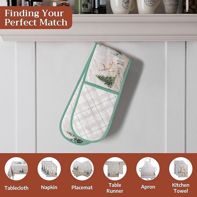 Maison d' Hermine Double Oven Mitt (7" x 35") 100% Cotton Heat Resistant BBQ Cooking Gloves with Loop for Thanksgiving Christmas Decorations Baking Cooking Handling Hot Pan (Deer in The Woods)
