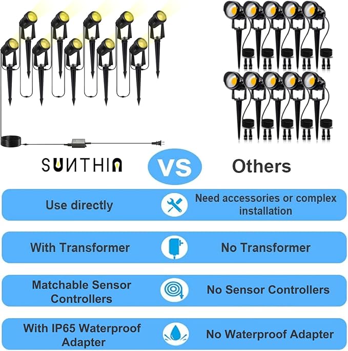 SUNTHIN Outdoor Landscape Lighting, 10 Pack Outdoor Spot Lights with Transformer for Yard, Plant, Lawn, Tree, Flags, House, Garden, Fence Use, IP65 Waterproof & Connectable
