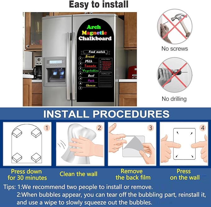 - 2025 NEW UPGRADE! INNOVATIVE ARCH DESIGN WITH SUPER STRONG MAGNETIC ADSORPTION: The 2025 upgraded self - adhesive arch - shaped blackboard sticker features an innovative arch design. With dimensions of 39.3"x17.5", It has super - strong magnetism and can be easily pasted onto smooth and texture - free surfaces, instantly transforming them into creative magnetic boards. Compared with traditional magnetic easels and magnetic paints, it is not restricted by space. It can be used immediately after pasting. Whether you want to create a home study corner, a message board, or a travel photo wall behind the door, it can handle them easily, conveniently meeting your needs for a magnetic space.